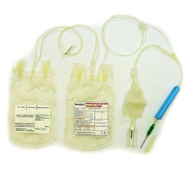 Пластиковые контейнеры для крови человека и её компонентов с раствором антикоагулянта ЦФДА-1 (CPDA-1) двойные одноразового использования стерильные WEGO, 250 мл с аксессуарами, предназначены для сбора и разделения цельной крови на два компонента, плазму и эритроциты, путем центрифугирования и экстракции.